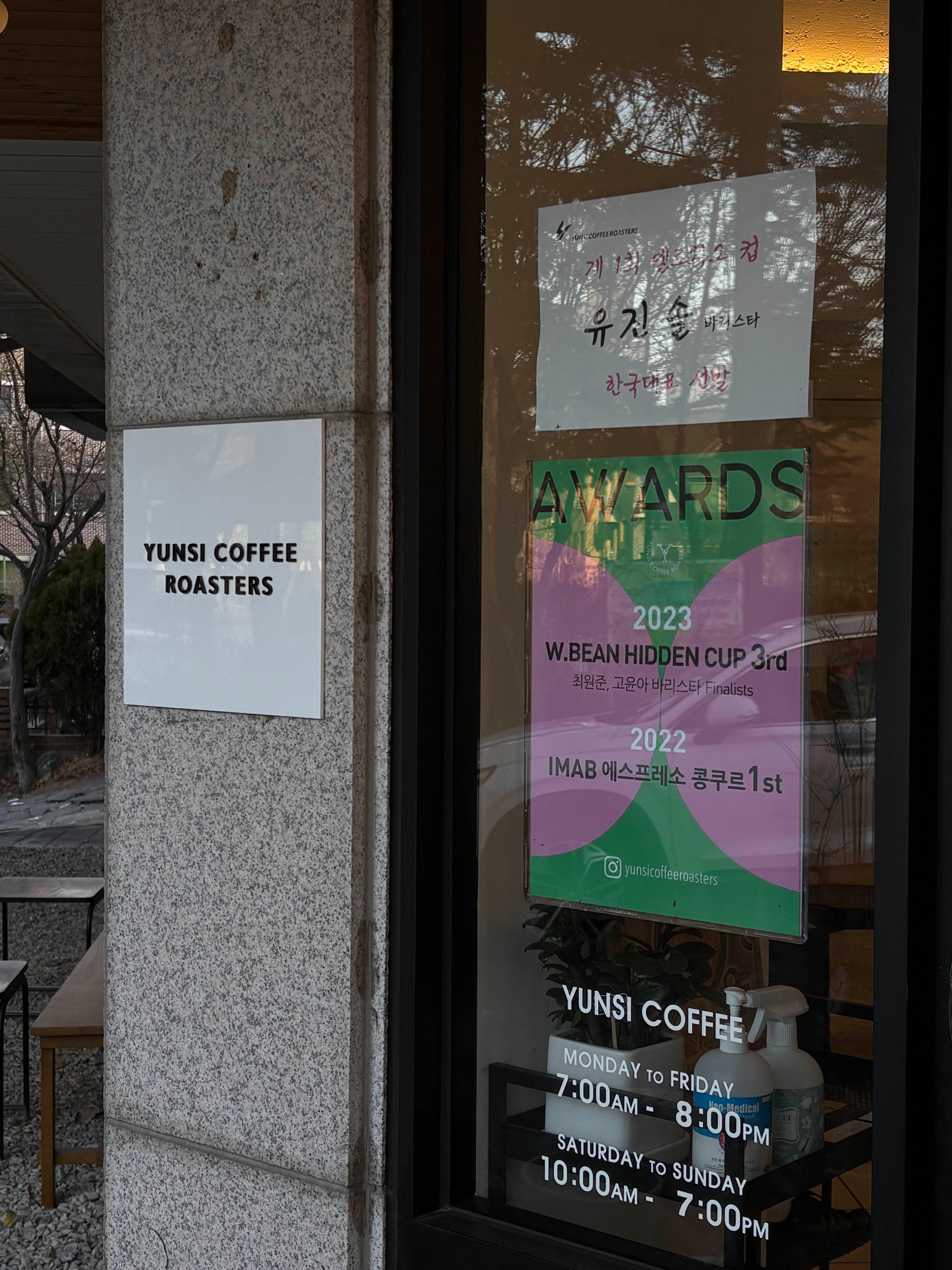 문 앞에 붙어있는 윤시커피로스터스 바리스타분들의 수상경력🏆