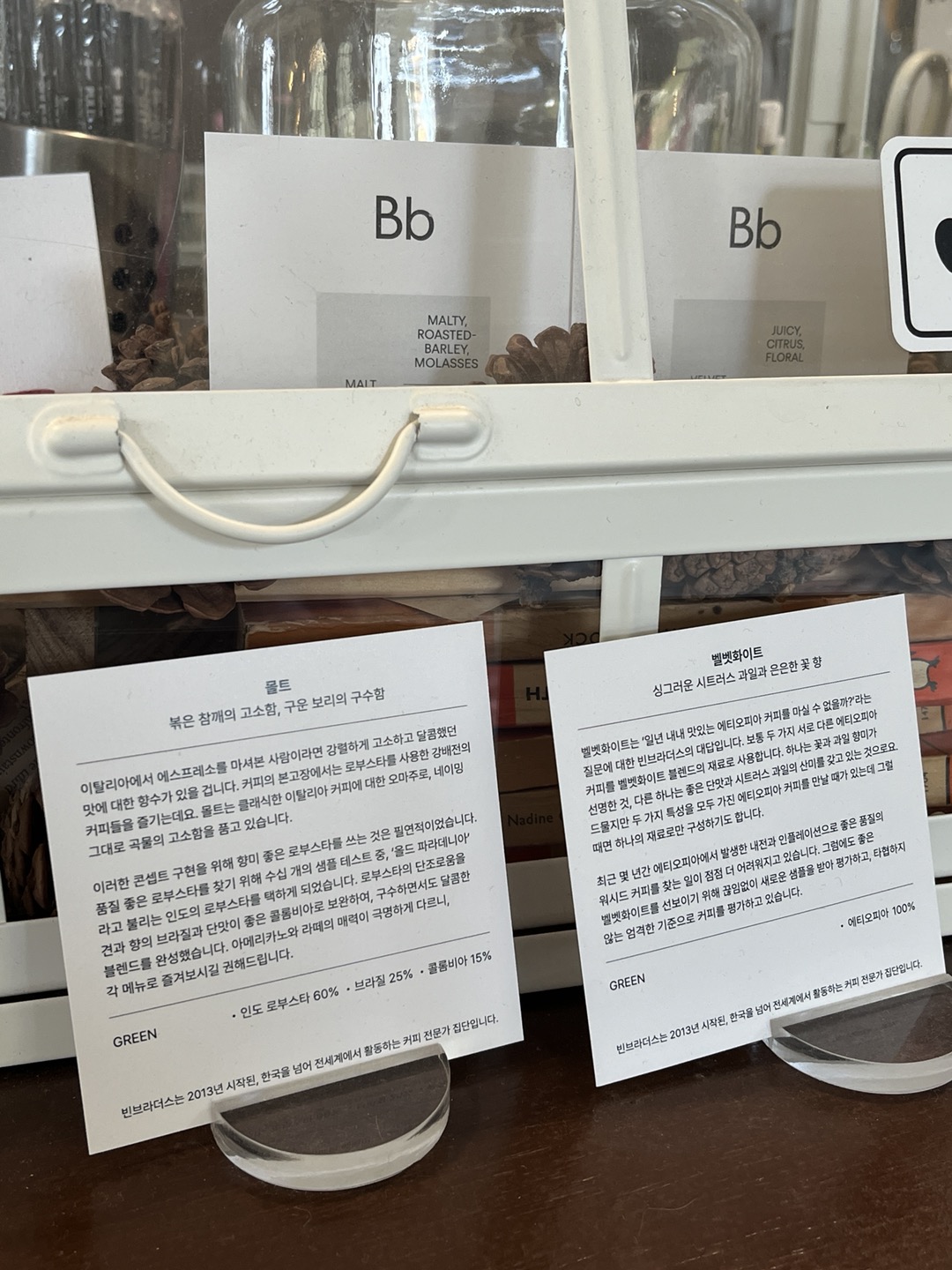 에스프레소 머신과 원두 설명이 자세하게 쓰여있는 노트에 빈브라더스가 적혀있더라고요!