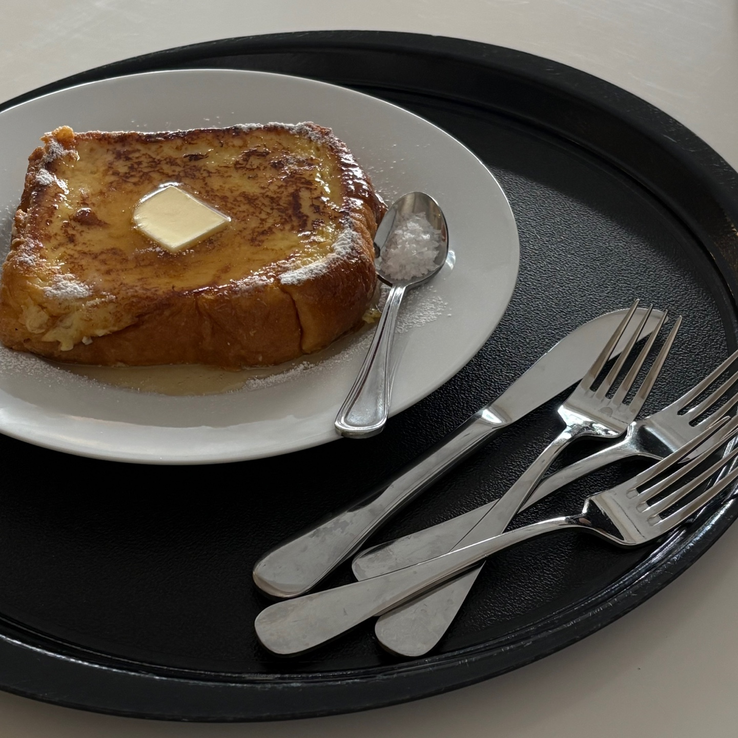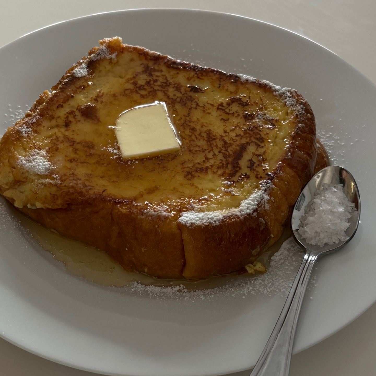 잘쿠워진 프렌치토스트에 버터올려서 녹이고 시럽과 옆에주신 말돈소금에 찍어서 먹으면